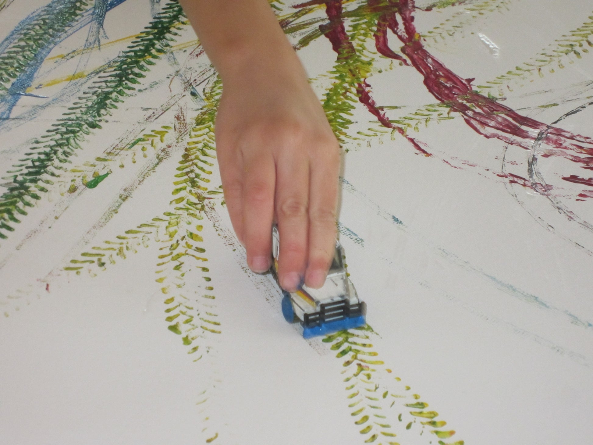 Wir lassen viele Miniautos durch Acrylfarben sausen und über eine große Leinwand rollen. Dabei entstehen farbige Spuren und ein einzigartiges Spuren-Kunstwerk. Zum Abschluss zeichnen wir gemeinsam auf einem Riesenblatt eine fantasievolle Rennstrecke.