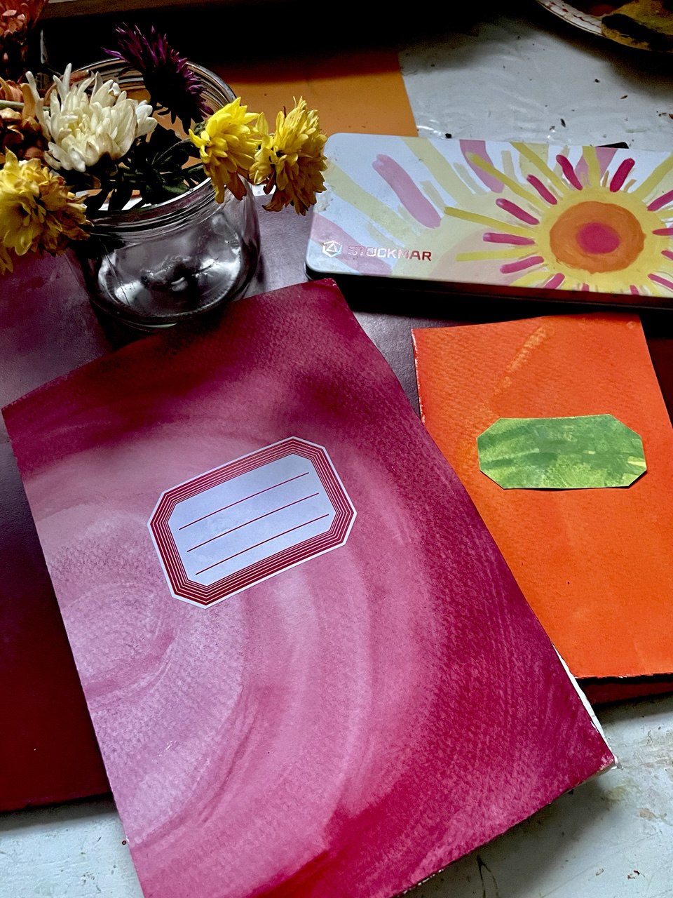 Wir arbeiten mit der Nass-in-Nass-Technik: Es wird gefaltet, geklebt und gemalt. Am Ende binden wir alles zusammen und schon ist das persönliche Heft fertig, das zu Geschichten, Zeichnungen und Geheimnissen einlädt.